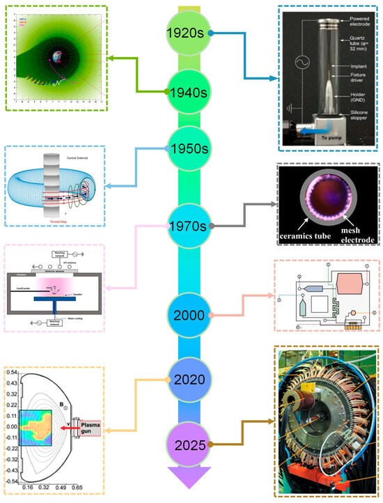 The concept of plasma, the fourth state of matter, emerged in the early 20th century. Its discovery can be attributed to Irving Langmuir in the 1920s, when he first recognized ionized gases in vacuum tubes and coined the term “plasma” (Figure 2) [10]. Over time, the theoretical foundations of plasma were established as researchers began to understand its unique behavior and applications, particularly in the context of ionized gases and astrophysics. Notably, plasmas were found to constitute the majority of visible matter in the universe, including the sun and stars. The 1950s represented a significant advancement in plasma research, with a focus on controlled nuclear fusion [11]. Scientists investigated the potential of plasma as a medium for achieving controlled thermonuclear reactions, which was pivotal for the development of fusion energy. However, despite promising theories, practical implementation remained a challenge due to the complex behavior of plasmas under extreme conditions.