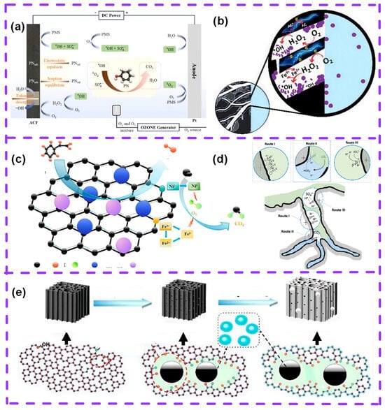 (a) Electricity, permono-sulfate, and ozone proposed and applied in the regeneration of phenol-saturated AC fiber. (b) Sintered AC both as an adsorption filter and as an electrode, allowing its simultaneous electrochemical regeneration. (c) Preparation of Ni-Fe bimetal-enriched adsorbent columns by successfully loading transition metals Ni and Fe onto AC saturated with styrene adsorption using a simple impregnation method. (d) A novel modified supercritical CO2 extraction for the regeneration of spent GAC. (e) Physical and chemical structural changes that occur during the conversion of AC.