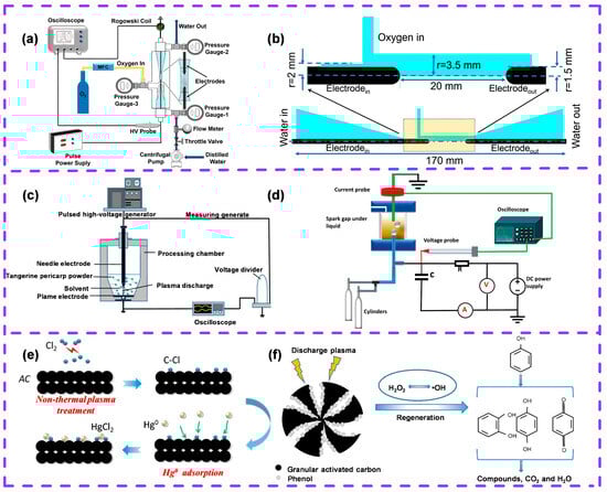 In recent years, plasma research has expanded into diverse fields, including medicine and environmental technology. Today, plasma remains a critical area of scientific inquiry, with applications ranging from energy storage to space propulsion, and its future appears promising because of ongoing advancements in plasma-based technologies (Figure 2) [14,15,16,17,18,19,20]. Both thermal and electrochemical regeneration methods face significant limitations. (a) Regarding the main drawbacks of thermal regeneration, high temperatures may damage the carbon skeleton, reduce the carbon content, and degrade the adsorption capacity, thereby limiting regeneration cycles. (b) The main drawbacks of electrochemical regeneration include low efficiency, micropore clogging, and potential secondary pollution resulting from chemical solvents. Plasma technology has demonstrated significant potential in various environmental applications, including air pollution control and wastewater treatment.