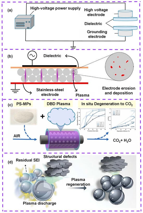 (a) Circuit diagram of DBD plasma. (b) Clectrode erosion leads to the deposition of microscopic particles on the materials inside the plasma reactor. (c) DBD plasma proposed for the degradation of polystyrene microplastics. (d) The self-induced microwave plasma method eradicates the SEI layer and restores the graphite lattice structure within 30 s.