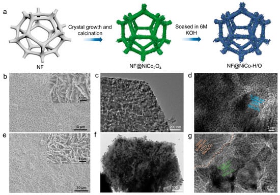 (a) Schematic illustration of the synthesis of the NF@NiCo-H/O. SEM images of the (b) NF@NiCo2O4 and (e) NF@NiCo-H/O, with insets showing the corresponding magnified images. TEM images for NF@NiCo2O4 with (c) low- and (d) high-magnification. TEM images for NF@NiCo-H/O with (f) low- and (g) high-magnification TEM.