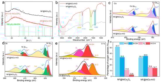 NF@NiCo2O4 catalyst and the NF@NiCo-H/O of (a) PXRD patterns, (b) FT-IR spectra. (c–f) XPS spectrum of (c) Co 2p, (d) Ni 2p, (e) O 1s, and (f) the proportion of different oxygen species.