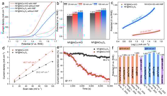 The HMFOR and OER performance of NF@NiCo2O4 and NF@NiCo-H/O were evaluated in 1.0 M KOH electrolyte with and without 50 mM HMF using a three-electrode system. Figure 3a shows the linear sweep voltammetry (LSV) curves, with the solution without HMF serving as the control. As shown in Figure 3b, NF@NiCo-H/O required only 1.317 V, 1.395 V, and 1.443 V to achieve current densities of 20 mA cm−2, 50 mA cm−2, and 100 mA cm−2, respectively, which are significantly lower than those of NF@NiCo2O4 (1.413 V, 1.458 V, and 1.514 V). Moreover, NF@NiCo-H/O achieved a limiting current density of 380 mA cm−2 at a voltage of 1.7 V, which is notably higher than that of the NF@NiCo2O4 catalyst (250 mA cm−2). Compared with the OER performance in 1.0 M KOH electrolyte without 50 mM HMF, the HMFOR performance of both NF@NiCo-H/O and NF@NiCo2O4 catalysts was significantly superior to their OER performance. Specifically, the potential difference between HMFOR and OER for the NF@NiCo-H/O catalyst at 100 mA cm−2 was 197 mV, while for the NF@NiCo2O4 catalyst at 20 mA cm−2, the HMFOR and OER potential difference was 236 mV. In addition, the NF@NiCo-H/O catalyst outperforms the recently reported non-noble metal catalysts (Figure 3f) [26,27,28,29,30,31,32], which also demonstrates the great potential of heterogeneous NF@NiCo-H/O catalysts for HMFOR.