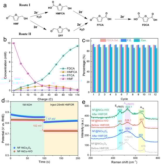 (a) Two pathways for the electrooxidation of HMF to FDCA. NF@NiCo-H/O catalyst of (b) concentration changes of various intermediate products under different charge quantities, (c) conversion rate of HMF, selectivity of FDCA, and Faradaic efficiency during twelve consecutive HMF electrooxidation reactions at 1.424 V. (d) OCP measurement of NF@NiCo2O4 and NF@NiCo-H/O. (e) Raman spectra of the NF@NiCo2O4 and NF@NiCo-H/O before and after chronoamperometry measurement.