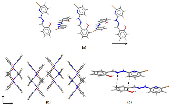 The Schiff base (HL) derived from the condensation reaction between 2-bromo-6-hydrazinylpyridine and benzaldehyde was prepared in a 1:1 molar ratio, based on previous studies [21]. The ligand was isolated as an air-stable pale beige solid that was soluble in DMSO, ethanol, methanol, and DMF but slightly soluble in water. In order to elucidate the molecular structure, the 1H-NMR spectrum of HL was recorded in DMSO-d6. The signals corresponding to the protons of the NH and OH groups are observed at 9 and 12 ppm, respectively. The azomethine (CH=N) proton appears as a singlet peak observed at δ = 8 ppm. In addition, in the range of 6–7 ppm, the expected signals appear as multiplet peaks corresponding to the aromatic protons of the organic structure. In the mass spectrum of HL, a peak at m/z = 291 is observed, indicative of the [M]+ ion. Another peak at m/z = 274 corresponds to [M-OH]+, and a peak at m/z = 197 represents [M-C6H5-OH]+. The solid was recrystallized in ethanol, obtaining a single crystal available for the single-crystal X-ray analysis. The (E)-2-((2-(6-bromopyridin-2-yl)hydrazono)methyl)phenol compound (HL) was crystallized in the orthorhombic space group Pbca (Figure 2, Table 1). The compound presents a conformation, E, with respect to the C=N bond. The molecule is almost planar, with torsion angles in C8–C7–C6–N3 and C4–C5–N2–N3 of 3.01(1) and 0.11(1)°, respectively. The O1–H1···N3 intramolecular interaction, with a distance of 2.644(4) Å, is observed. N2–H2···O1, with a distance of 3.080(4) Å, joins the molecules along the [010] direction (Figure 3a). The 3D supramolecular arrangement is given by π-π slipped-stacking interactions, with distances for N2···C12 and C4···C8 of 3.527(6) and 3.397(6) Å along the [100] and [001] directions (Figure 3b,c).