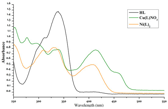 The analysis of absorption spectra allows for the identification of electronic transitions and the monitoring of metal complex formation, which confirms their synthesis through changes in the absorption bands. Electronic absorption spectra were obtained for HL and its complexes in the wavelength range of 200 to 800 nm (1 × 10−3 M in MeOH at 25 °C) (Figure 5). The HL Schiff base ligand’s absorption spectrum showed three strong bands at around 240, 311, and 340 nm. These bands could be caused by π-π* or n-π* transitions [26]. When the absorption spectra of the ligand HL and the M(II) complexes were compared, a hypochromic effect was seen in the absorption peaks and the appearance of new bands. There are broad bands at 413 nm for complex 1 and at 408 nm for complex 2. These bands are caused by the charge transfer between the metal ion and the organic ligand, while the band at 458 nm in the spectrum of complex 1 might be caused by charge transfers from the nitro group to the copper center [27,28,29]. These changes indicate the formation of complexes between the metal cations and the organic ligand HL.