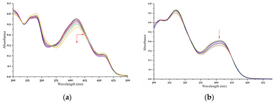 The electron absorption spectra at a constant concentration of 50 μmol·L−1 of 1 (a) and 2 (b), titrated with CT-DNA to concentrations of 0 μmol·L−1 (green), 10 μmol·L−1 (red), 15 μmol·L−1 (blue), 20 μmol·L−1 (dark green), 25 μmol·L−1 (orange), 30 μmol·L−1 (pink), 35 μmol·L−1 (purple), 40 μmol·L−1 (grey), 45 μmol·L−1 (yellow), and 50 μmol·L−1 (brown) in nucleotides. The arrows show the changes upon increasing the amounts of CT DNA.