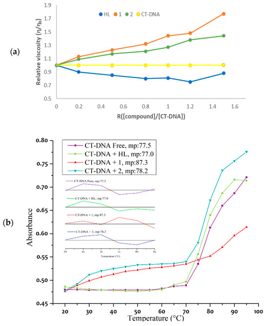 Viscosity measurements are a highly sensitive tool to validate the interaction between compounds and DNA, since they reflect the structural modifications and size alterations resulting from the binding. The viscosity of a CT-DNA solution (600 μM) was determined upon the addition of increasing concentrations of the compounds HL, 1, and 2 (R = [compound]/[DNA]) of between 0 and 1.5 (Figure 7a). The efflux times were recorded by processing the video’s photograms with Camtasia Studio® software. The data showed that the relative viscosities of DNA increased when the CT-DNA complex adduct was formed with metal complexes 1 and 2, presenting a common behavior of compounds that intercalate inside the nucleobases of DNA, as they induce the elongation of the DNA by unwinding or stretching the double helix [38]. Additionally, the binding mode of the synthesized compounds was studied through DNA melting curves, measuring the electronic absorption at the maximum absorbance of DNA (260 nm) (Figure 7b). It was observed that both complexes 1 and 2 cause an increase in the melting point (Tm) of DNA. Interestingly, the experiment showed that the interaction of complex 1 generated an increase in the Tm (~10 °C) of DNA, which is usually related to an intercalation binding mode that generates greater stability between the strands of the DNA double helix [39]. This result is consistent with the highest value in the intrinsic binding constants (Kb) and viscosity measurements observed for complex 1.