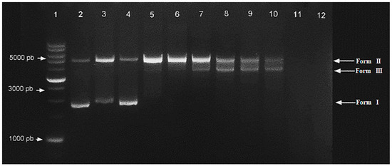 Metal complexes might induce genotoxicity by causing damage or conformational alterations in the DNA of prokaryotic and eukaryotic cells, which can lead to cell death by apoptosis [40]. Therefore, analyzing these interactions is crucial for understanding the mechanisms of action of certain drugs and developing new therapeutic strategies. DNA is a macromolecule that can present different conformations that affect the electrophoretic mobility in the agarose gel. Double-stranded, circular, supercoiled DNA (form I) has a higher electrophoretic mobility than relaxed, circular DNA (form II). Form III is the linear conformation resulting from the cleavage of form II, and its electrophoretic migration is between form I and form II [22,41]. In this study, the effects of compounds HL, 1, and 2 on the DNA conformation of the pmCherry vector isolated from E. coli BL21 were analyzed in the presence and absence of H2O2 by monitoring the reaction by electrophoresis in a 1% agarose gel with a 1X TAE buffer at a pH of 7.2 and with Bioline HyperLadder™ 1 kb as a molecular weight marker. Figure 8 and Figure 9 illustrate the displacement patterns of the vector in response to the interaction with the analyzed compounds.