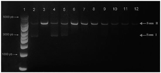 The results obtained showed that both complexes 1 and 2 can alter the conformation of DNA in the absence of an exogenous reagent (H2O2, lane 5, Figure 8 and Figure 9), favoring the relaxed, circular form (form II), while the control (free plasmid) and the HL ligand did not generate significant changes in the conformation of the plasmid DNA (lanes 2 and 4, Figure 8 and Figure 9). In the presence of H2O2, complexes 1 and 2 showed an increase in oxidative DNA cleavage as the concentration of the complexes increased. This is particularly evident for complex 1, where a reactive oxygen species generator contributed to an increase in oxidative DNA cleavage (lanes 6–10) [23], resulting in the appearance of the linear conformation (form III). At a concentration higher than 50 μmol·L−1, damage was generated in the DNA, and the bands corresponding to the supercoiled form of DNA (form I) were not observed in the gel (Figure 8, lanes 11 and 12).