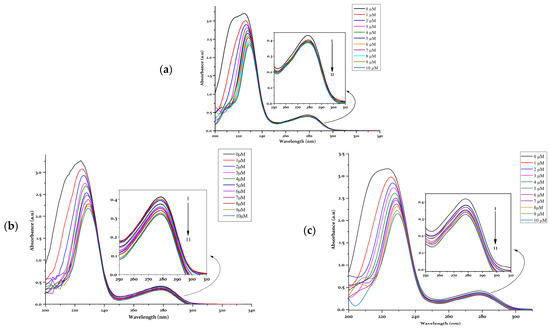 Figure 10 shows the absorption spectra of BSA after titration with the compounds, where two phenomena stand out: a notable decrease in the intensity of the absorption spectrum and a bathochromic effect on the peak of the protein secondary structure, demonstrating a clear affinity of the compounds for the protein. This change in the absorption spectra suggests a static quenching mechanism [42].