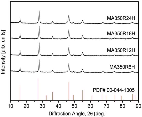 4) due to notable similarities in their diffraction signatures. Specifically, the sample processed via MA for 6 h at 350 rpm (denoted MA350R6H) displayed a well-defined single-phase tetragonal structure, indicating that short-duration milling is sufficient to induce solid-state reactions and phase stabilization. When the milling time was extended to 24 h (MA350R24H), no secondary phases were detected, and the diffraction pattern remained consistent, suggesting that prolonged MA does not compromise phase integrity, nor does it induce additional transformations. This stability under extended milling implies a robust structural resilience in CuFeSe