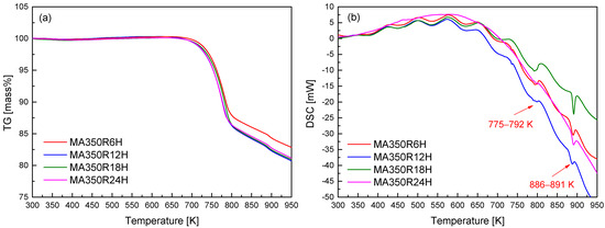 2. The DSC curves exhibit distinct thermal events across all MA powders, characterized by minor endothermic peaks between 775 and 792 K and more pronounced endothermic peaks around 886–891 K. These thermal signatures correspond, respectively, with the onset of decomposition/volatilization and congruent melting of CuFeSe