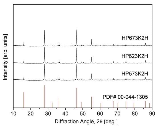 2 specimens consolidated by HP at various temperatures, utilizing mechanically alloyed powders synthesized under the optimized milling conditions (MA350R12H). The sample labels, such as “HP623K2H”, denote the specific sintering parameters—hot pressing at 623 K for 2 h. The XRD results verify that the eskebornite phase remains structurally stable throughout the HP process, with no observable phase decomposition or formation of secondary phases. This phase retention under thermal and mechanical compaction conditions is of critical importance, as it ensures the preservation of the material’s intrinsic thermoelectric properties, which are strongly dependent on structural integrity. A comparative analysis of the diffraction patterns reveals that the broadened peaks observed in the as-milled powders (