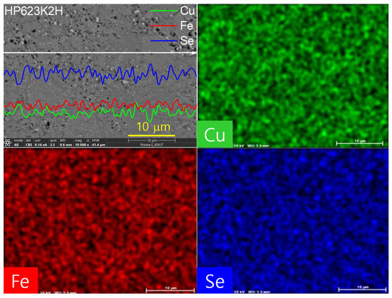 2 specimen sintered at 623 K for 2 h (designated HP623K2H), along with the corresponding EDS results. Both the one-dimensional line scan profiles and two-dimensional elemental mapping confirm a uniform spatial distribution of Cu, Fe, and Se throughout the microstructure. This homogeneous distribution of elements is critical in maintaining the intrinsic thermoelectric behavior of the material, as compositional uniformity minimizes the potential for compositional inhomogeneities, secondary phase formation, or localized stoichiometric imbalances. The absence of detectable secondary phases in the EDS spectra strongly supports the preservation of the single-phase tetragonal CuFeSe