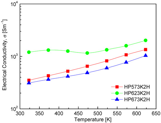 27]. Among the tested samples, the HP623K2H specimen exhibited the highest electrical conductivity, reaching 1.2 × 10