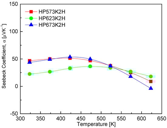 2 were observed between 423 and 473 K, with the HP573K2H specimen exhibiting the highest Seebeck coefficient of 51.3 μVK