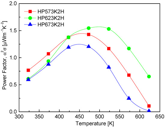 2 as a function of temperature, calculated from the measured Seebeck coefficient and electrical conductivity. The results show that the PF reaches its maximum in the temperature range of 473–523 K, which corresponds with the optimal interplay between charge carrier mobility and carrier concentration. Specifically, the HP573K2H and HP623K2H samples exhibit peak PF values of 1.43 μWm