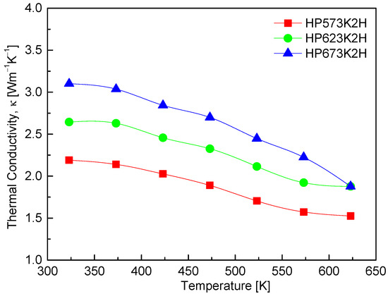 2. In addition to temperature effects, the HP temperature also influences thermal conductivity. Higher HP temperatures appear to increase the thermal conductivity across the entire temperature range. For example, the HP573K2H sample shows a reduction in thermal conductivity from 2.19 Wm
