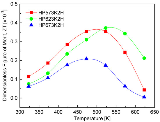2 as a function of the temperature. The ZT values exhibit a temperature-dependent increase, peaking in the range of 473–523 K. This trend reflects the interplay of thermoelectric transport parameters—namely, the Seebeck coefficient, electrical conductivity, and thermal conductivity—all of which vary with the temperature. The observed rise in ZT with increasing temperature can be attributed primarily to the enhancement of the Seebeck coefficient and power factor near the intrinsic transition region. Among the samples analyzed, the HP623K2H specimen exhibited the highest ZT value of 0.37 × 10