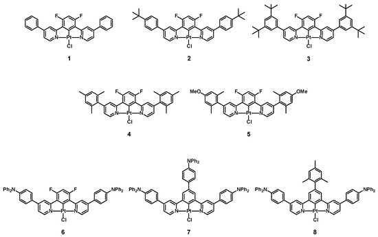 Complexes 1–8 constitute an interesting family of N^C^N-platinum(II) complexes, and some of them have already found applications. For example, complex 6 allowed the fabrication of both yellow-green and deep red OLEDs [99] whereas complex 4 turned out to be a springboard for blue OLEDs.