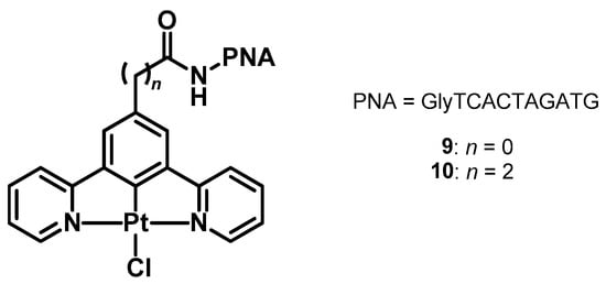 Furthermore, we were curious to exploit the known anticancer properties of Pt(II) complexes in the case of compounds presenting a terdentate N^C^N ligand [100]. Therefore, in 2025, we prepared two new compounds by conjugating a peptide nucleic acid (PNA) made of ten nucleobases together with a platinum(II) complex having a COOH group directly bound to the N^C^N scaffold or separated from it by an ethylene linker (complexes 9 and 10, respectively; Figure 3). The study pointed out not only the non-cytotoxic nature of the conjugates but also an improved phosphorescence of complex 10, presumably thanks to the long PNA chain able to protect the Pt(II) core from external quenching oxygen, resulting in Φlum > 0.37 even in the presence of air (Table 3).
