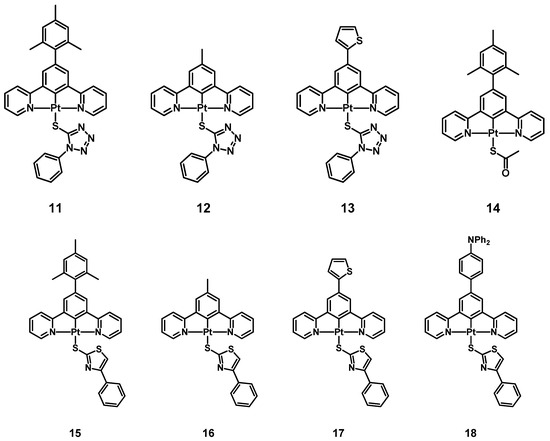 Important results were obtained in the case of heteroaromatic thiolates such as 1-phenyl-1H-tetrazole-5-thiolate and 4-phenylthiazole-2-thiolate, leading to the synthesis and characterization of complexes 11–13 and 15–18 (Figure 4). While both thiolate ligands were tested on the N^C^N-Pt(II) complexes presenting a mesityl, a methyl, and a 2-thienyl substituent on the benzene ring, the phenyl-thiazole-thiolate was introduced also on the compound having a 4-NPh2-phenyl group.