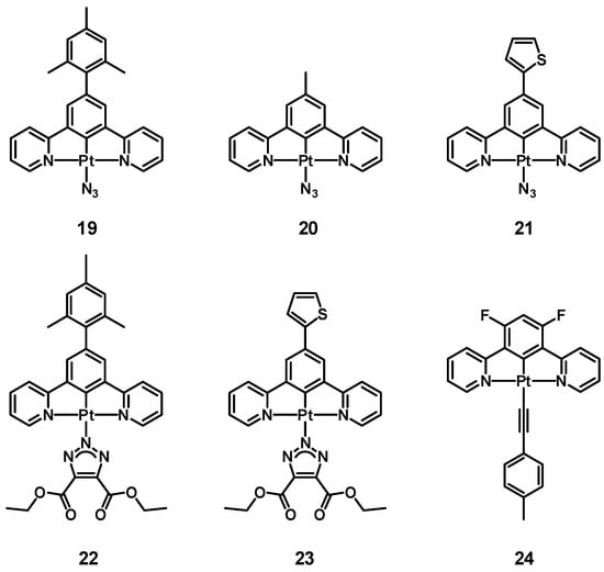In addition, we prepared new complexes by conjugating a peptide nucleic acid (PNA) with a platinum(II) complex having a COOH group directly bound to the N^C^N scaffold (complex 9) or separated from it by an ethylene linker (complex 10), putting in evidence the non-cytotoxic nature of the conjugates. In the case of complex 10, the long PNA chain can protect the Pt(II) core from external quenching oxygen, resulting in a Φlum > 0.37 even in the presence of air. This complex is particularly appealing for biomedicine. Azido complexes of Pt(II) such as 19 can find applications in photoactivated chemotherapy, for example, due to their potential ability to intercalate in DNA and to photorelease azidyl radicals able to damage cancer cells.