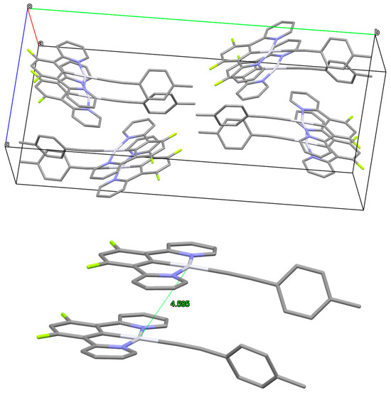 For complexes 1 and 2, as the concentration is augmented, a structureless, broad band grows in, with λmax at 704 nm and 697 nm, respectively, attributed to the formation of emissive, bimolecular excited states (excimers and/or aggregates). For complex 3, the related band, at 690 nm, is much less intense at the same concentration, probably due to the steric hindrance caused by the presence of two tert-butyl groups on the phenyl linked to the pyridine rings that inhibits the neighboring of two molecules [97]. Similarly, the corresponding band at 680 nm is weak upon the introduction of a 2,4,6-trimethyl phenyl substituent (complex 4) [98] or a 4-methoxy-2,6-dimethyl phenyl substituent (complex 5) [96] on the pyridine rings, because the two methyls ortho to the interannular C–C bond hamper the planar conformation that favors face-to-face intermolecular interactions (see Figure 2) [96,98]. In contrast, for complex 6 bearing a diphenylamino group on the phenylpyridine unit, the structureless broad band at 696 nm is very intense [99].