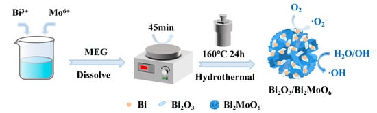 Above all these advantages, a three-dimensional novel Bi-enriched Bi2O3/Bi2MoO6 (short for BBO/BMO) Z-scheme [8,9] heterojunction photocatalyst was successfully synthesized via a facile one-step hydrothermal method. Through rational metal self-doping modification, the optimized BBO/BMO system exhibited exceptional interfacial compatibility, significantly improving structural stability while simultaneously enhancing charge separation and extending the optical absorption spectrum. Notably, the catalyst demonstrated efficient degradation of phenol in wastewater within 60 min, with its photocatalytic activity enhanced by two-fold compared to the unmodified material. The efficient photocatalytic process of BBO/BMO involves the following three steps. First, self-doped atoms optimize the internal electric field, enhancing the migration rate of photogenerated electrons and accelerating their transfer to the catalyst surface, where they trap O2 and reduce it to reactive ·O2− radicals. Second, the constructed Z-scheme heterojunction facilitates effective charge separation of photogenerated electron–hole pairs, promoting hole (h+) formation and improving catalytic efficiency. Third, the visible light response range is broadened, accelerating the formation of reactive oxygen species (ROS) such as ·O2− and ·OH, which effectively degrade and mineralize pollutants. All in all, this study provides new insights into designing self-doped photocatalysts, paving the way for their large-scale application in water remediation [13,14,15,16,17,18].