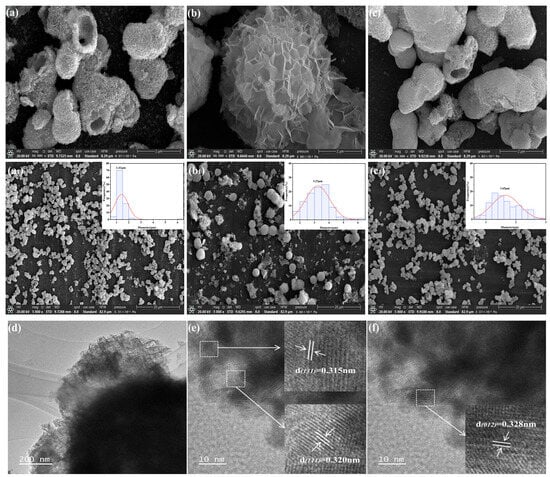 The morphological and microstructural characteristics of the catalysts were systematically investigated by scanning electron microscopy (SEM) and transmission electron microscopy (TEM). As shown in Figure 2a–c, BMO exhibits a well-defined three-dimensional (3D) hollow nanoflower-like architecture with an average diameter of approximately 1.41 μm. In contrast, the BBO samples primarily consist of two-dimensional (2D) nanosheets with an average thickness of about 10–20 nm, hierarchically assembled into spherical microparticles with 3.23 μm in diameter [19]. Remarkably, the BBO/BMO composite demonstrates a distinct hierarchical structure, where ultrathin BBO nanosheets are uniformly distributed on the surface of the hollow spherical BMO framework (Figure 2c,d). These composite nanosheets appear more detailed and regularly structured compared to their pure BBO counterparts, clearly indicating the successful formation of an integrated heterojunction structure. High-resolution TEM (HRTEM) analysis of the BBO/BMO samples reveals two distinct lattice fringes with measurable interplanar spacings. As shown in Figure 2e, the observed lattice spacing of 0.315 nm matches well with the (131) plane of BMO, while the 0.320 nm spacing corresponds to the (111) plane of BBO. Furthermore, Figure 2f demonstrates an additional lattice spacing of 0.328 nm, which can be indexed to the (012) plane of metallic Bi nanoparticles.