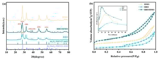 XRD patterns of the synthesized BMO, BBO, and BBO/BMO (a), N2 adsorption–desorption isotherms and PSD curves (inset) of BMO, BBO, and BBO/BMO (b).