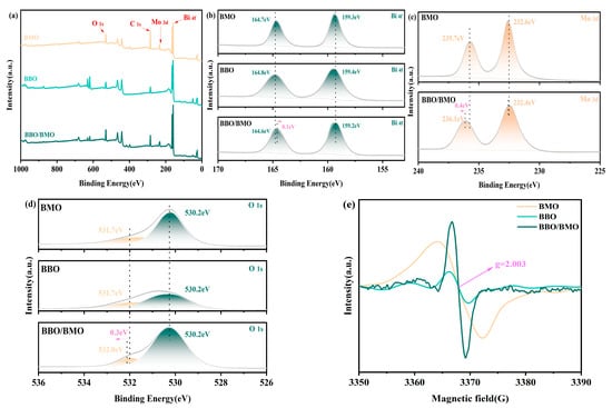 XPS survey spectra of BMO, BBO, and BBO/BMO (a), Bi 4f (b), Mo 3d (c), O 1s (d), ESR spectra of BMO, BBO, and BBO/BMO (e).
