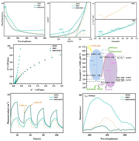 UV-vis DRS (a), (αhυ)2 versus hυ plots (b), Mott–Schottky curves of sample BMO, BBO, and BBO/BMO (c), electrochemical impedance spectra (d), energy band structure diagrams of the samples (e), band structure diagrams of BMO and BBO (f), PL spectra (g).