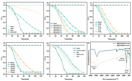 Figure 6 presents the photocatalytic degradation performance of phenol in simulated wastewater under visible light irradiation using three different photocatalysts. Compared to the photodegradation efficiencies of BBO and BMO, the composite photocatalyst demonstrates significantly enhanced degradation efficiency, achieving nearly complete phenol removal within 60 min, as shown in Figure 6a. As illustrated in Figure 6b, the BBO/BMO composite with a mass ratio of 3:7 exhibited optimal photocatalytic performance, achieving 99% degradation efficiency. These results demonstrate that BMO modification with BBO effectively enhances photocatalytic stability and degradation performance [33]. Further experiments were conducted to evaluate the effects of catalyst dosage and initial phenol concentration. For the optimal 3:7 BBO/BMO composite, the optimal catalyst dosage was determined to be 0.1 g (Figure 6c), and the initial phenol concentration ranging from 10 to 30 mg/L, with 30 mg/L selected as the standard concentration for subsequent experiments (Figure 6d) (the highest degradation efficiency was observed at 60 min). To identify the dominant reactive species in the photocatalytic process, radical trapping experiments were conducted under the controlled conditions: 0.1 g of the catalyst, 30 mg/L of phenol, and a reaction time of 60 min. Specifically, three scavengers were employed to identify the dominant reactive species: p-benzoquinone (BQ, 10 mM) for superoxide radicals (·O2−), EDTA-2Na (10 mM) for holes (h+), and isopropanol (IPA, 20 mM) for hydroxyl radicals (·OH). As depicted in Figure 6e, the addition of each scavenger during the degradation process resulted in varying degrees of suppression of the degradation efficiency [34,35]. Compared to the control system (without scavengers), the degradation efficiency of BBO/BMO decreased dramatically from 97% to 36% upon the addition of BQ (·O2− scavenger), indicating that ·O2− played a predominant role in the photocatalytic degradation process. When EDTA-2Na (h+ scavenger) and IPA (·OH scavenger) were introduced, the degradation efficiency was, respectively, reduced to 44% and 53.74% [36,37,38], suggesting the participation of both holes and hydroxyl radicals in the reaction mechanism. Overall, these results conclusively demonstrate that ·O2−, h+, and ·OH serve as the primary active species responsible for phenol degradation.