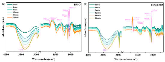 As is shown in Figure 7, the in situ FTIR spectra of BMO and BBO/BMO both display a broad peak between 3700 cm−1 and 3200 cm−1, corresponding to surface hydroxyl (-OH) stretching vibrations of surface hydroxyl groups (-OH). This observation confirms the presence of surface hydroxyl groups that serve as active sites for the generation of ·OH radicals during photocatalytic processes. The abundant surface hydroxyl groups significantly enhance the oxidative degradation capability of the catalysts. Notably, quantitative analysis reveals that the peak area of BBO/BMO is 1.08 times (at 4 min) and 1.13 times (at 8 min) larger than that of BMO, indicating its superior oxidative performance. Compared to BMO, BBO/BMO showed stronger absorption intensity and faster enhancement rate in this region, especially during 4–8 min, indicating that the introduction of BBO significantly enhanced the hydroxyl group density and reactivity. The C-H vibrational peaks were observed between 2980 cm−1 and 2950 cm−1, and the C-H region represents the presence of adsorbed organic pollutant molecules [39]. BBO/BMO showed more pronounced and sharper C-H absorption peaks in this region, indicative of its superior capacity to adsorb organic molecules. BBO/BMO shows more obvious and sharper C-H absorption peaks in this region, indicating its stronger adsorption capacity for organic molecules, which are conducive to the enrichment of reactants on the catalytic surface. Notably, compared to pristine BMO (Figure 7a), the BBO/BMO composite (Figure 7b) exhibits a 15.9% intensity enhancement at 1048 cm−1 (Table S4), accompanied by a 4 cm−1 blue shift from 1044 cm−1 to 1048 cm−1. These results clearly demonstrate that the incorporation of BBO significantly enhances the oxygen vacancy signals in the BBO/BMO composite, which is favorable for improving catalytic activity and well consistent with the EPR measurements [40,41].