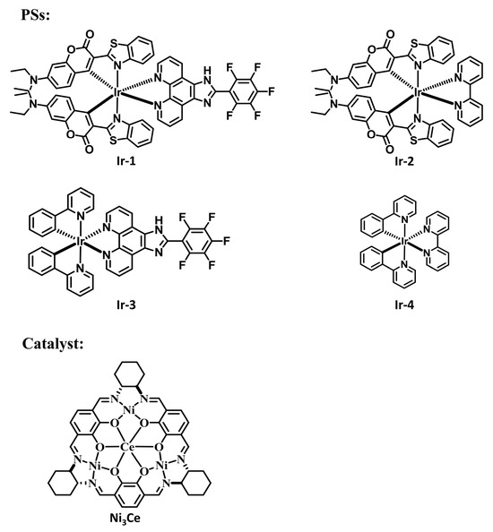 The following supporting information can be downloaded at https://www.mdpi.com/article/10.3390/inorganics13070229/s1, Figure S1: UV-Vis spectra of four PSs (0.5 mM) in DMF; Figure S2: Steady-state emission spectra of Ni3Ce (0.5 mM) and four PSs (0.5 mM) in DMF with 450 nm excitation; Figure S3: (a) Steady-state fluorescence quenching of Ir-1 (0.025 mM) with different concentrations of 4-methylbenzenethiol in DMF. (b) Stern–Volmer analysis of the results. The excitation wavelength is 450 nm; Figure S4. (a) Steady-state fluorescence quenching of Ir-1 (0.025 mM) with different concentrations of pyridine in DMF. (b) Stern–Volmer analysis of the results. The excitation wavelength is 450 nm; Figure S5: ESI-MS spectrum of [Ir(coum)2(ppipH)]+ in CH3CN; Figure S6: ESI-MS spectrum of [Ir(ppy)2(ppipH)]+ in CH3CN; Figure S7: ESI-MS spectrum of [Ni3Ce]+ + 2H2O in CH3OH; Figure S8: 1H NMR spectra of Ni3Ce; Figure S9: 1H NMR spectra of ppipH; Figure S10: 1H NMR spectra of Ir-1; Figure S11: 1H NMR spectra of Ir-2; Figure S12: 1H NMR spectra of Ir-3; Figure S13: 1H NMR spectra of Ir-4.