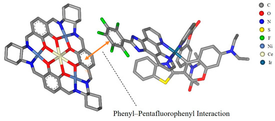 Metallasupramolecules have garnered significant interest due to their unique structures and functional advantages, facilitating the development of diverse molecular architectures with tailored properties [29,30,31,32]. A prominent area of focus is the advancement of flask-like catalytic prototypes, which exhibit remarkable suprastructures and catalytic characteristics [33,34,35]. Notably, a novel [3 + 3] Schiff base macrocycle [36] that features three N2O2 salphen-type binding sites serves as a macrocyclic tris(salen) ligand, enabling the formation of a new family of heterometallic catalysts. These catalysts offer tunable performance through the manipulation of metal ions at the salen and trimetal crown ether sites. This study highlights the successful integration of an Ir(C^N)2(N^N) PS with a hetero-tetranuclear LnNi3 complex (Figure 1), utilizing the pentafluorophenyl–phenyl interaction (as shown in Figure 2, which is a schematic diagram created using Material Studio [37] to illustrate the interaction site, and is not based on DFT calculations or crystallographic data) to achieve exceptional photocatalytic activity in C-S cross-coupling reactions.