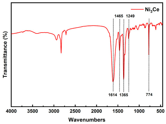 This study investigated the impact of phenyl–pentafluorophenyl interactions between different PSs and Ni3Ce catalysts on the C-S cross-coupling reaction. The synthesis of four PSs, namely Ir-1, Ir-2, Ir-3, and Ir-4, and Ni3Ce was confirmed through 1H NMR and ESI-MS (the figure is provided in the Supplementary Materials). For Ni3Ce, Fourier-transform infrared (FTIR) spectroscopy (Figure 3) further confirmed its synthesis, in which there were no peaks indicative of unreacted aldehyde or amino groups, thus confirming the complete conversion of the starting materials. Characteristic peaks at 1614 cm−1 and 1465 cm−1 in the FTIR spectra correspond to the C=N bond. The peak at 1365 cm−1 and 1249 cm−1 correspond to the stretching vibrations of the C=N and C-O bonds, respectively. The peak at 774 cm−1 corresponds to the out-of-plane bending vibration of C-H on the benzene.