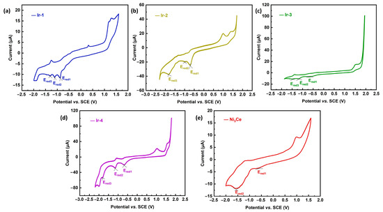 CVs of (a) Ir-1, (b) Ir-2, (c) Ir-3, (d) Ir-4 and (e) Ni3Ce. Conditions: compounds (1 mM), TBAPF6 (0.1 M), scan rate 50 mV·s−1. Glassy carbon working electrode, saturated calomel electrode (SCE) reference electrode, and platinum foil counter electrode.