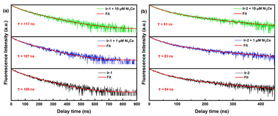 (a) Normalized luminescence decay kinetics of Ir-1 with different concentrations of Ni3Ce. (b) Normalized luminescence decay kinetics of Ir-2 with different concentrations of Ni3Ce. Conditions: 450 nm excitation, 25 μM Ir-1 (or Ir-2). The red curves are fits according to double exponential decay. The y-axis is in log scale.