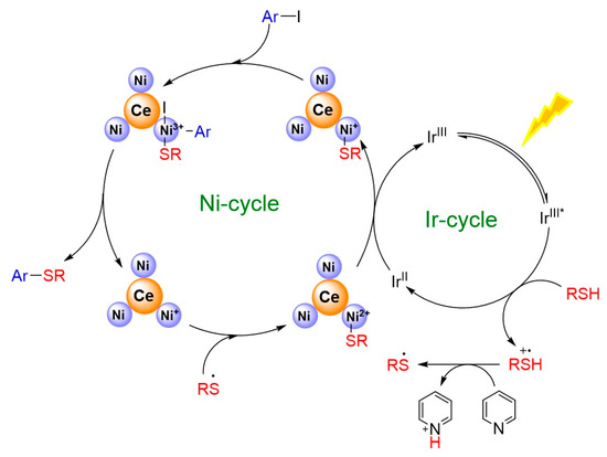 The catalytic properties of the Ni3Ce and Ir-1 system were rigorously evaluated under standard conditions (Scheme 1), revealing that the presence of electron-withdrawing groups on thiols significantly enhances the conversion rates in the C-S cross-coupling reaction. This phenomenon is attributed to the weakening of the C-I bond, facilitating the oxidative addition with nickel ions. While alterations to the thiol groups did not markedly impact product yields, optimal results were achieved with substrates such as benzyl mercaptan and cyclohexanethiol, which exhibit favorable electronic characteristics. In conjunction with the redox potential of Ir-1 and previous reports [13], we propose a reaction mechanism for the system as illustrated in Figure 7. Upon irradiation with visible light, Ir-1 is excited to the IrIII* state, which subsequently participates in a single electron transfer with thiols. This interaction results in the formation of IrII and a thiol radical cation, highlighting the intricate dynamics of this photochemical process. The reaction mechanism, supported by fluorescence quenching experiments (Figure S3) and the Stern–Volmer analysis (I0/I = 1 + KSV[Q]) yielding a KSV of 16.4 M−1, confirmed that thiols effectively quench the excited state of Ir-1. In this reaction sequence, pyridine facilitates the deprotonation of a thiol radical cation, yielding a thiyl radical. Concurrently, IrII reduces Ni2+ on Ni3Ce to form Ni+. The thiyl radical swiftly reacts with Ni+ to generate a Ni2+-SR complex, which is further reduced by IrII, regenerating IrIII. The resulting Ni+-SR undergoes oxidative addition with an aryl iodide, followed by a reductive elimination step that produces Ni+ and the final product, Ar-SR.