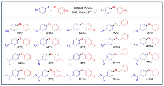 - Oderinde, M.S.; Frenette, M.; Robbins, D.W.; Aquila, B.; Johannes, J.W. Photoredox Mediated Nickel Catalyzed Cross-Coupling of Thiols With Aryl and Heteroaryl Iodides via Thiyl Radicals. J. Am. Chem. Soc. 2016, 138, 1760–1763. [Google Scholar] [CrossRef] [PubMed]
