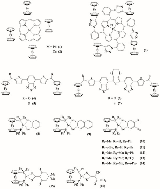 - Huang, Z.; Yu, H.; Wang, L.; Liu, X.; Lin, T.; Haq, F.; Vatsadze, S.Z.; Lemenovskiy, D.A. Ferrocene-contained metal organic frameworks: From synthesis to applications. Coord. Chem. Rev. 2021, 430, 213737. [Google Scholar] [CrossRef]