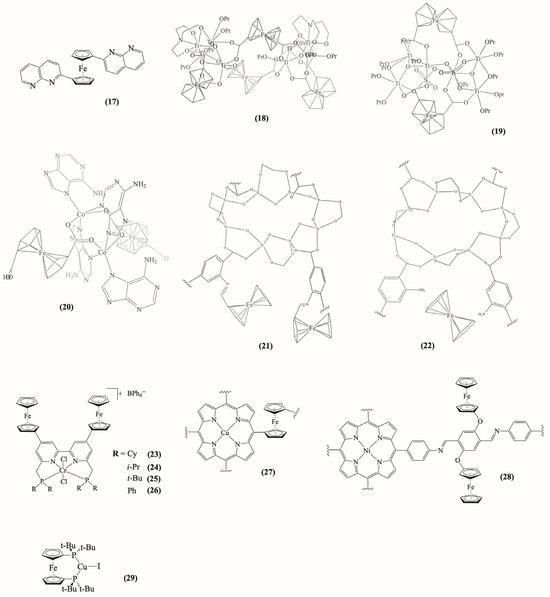 Ferrocene-based molecular and hybrid catalysts reported for CO2RR. Structures 17–20 include molecular Fc–metal complexes and photocatalytic systems. Structures 21–22 are MOFs incorporating Fc via covalent or non-covalent grafting. Structures 23–26 are homogeneous or supramolecular Fc-containing photocatalysts. Structures 27–28 represent Fc-integrated porous materials (polymer and COF) used in electrocatalytic CO2RR. Structure 29 is a molecular catalyst incorporating a Fc-based diphosphine ligand for homogeneous CO2 hydrogenation.