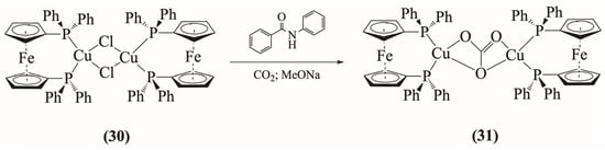 Ferrocene-based diphosphine ligands have proven effective in Cu-mediated CO2 fixation. As shown in Scheme 1, the direct reaction of complex 30 with CO2 and benzaldehyde under basic conditions yields the μ–η2:η2-carbonato-bridged dicopper(I) complex 31 [68]. The dinuclear species features a nearly planar Cu2CO3 core with side-on coordination of the carbonate in relation to both Cu(I) centres. X-ray diffraction reveals Cu–O distances of ~2.0 Å and a delocalised C–O bond framework, while IR spectra confirm carbonate coordination with strong asymmetric and symmetric stretching bands at 1576 and 1341 cm−1, respectively [68].