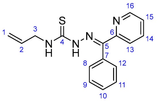 The synthesis was carried out similarly to the described procedure in [13]. 4-Allylthiosemicarbazide (1.31 g, 0.100 mol) was dissolved in 20 mL of ethanol in a flat-bottomed flask. 2-Benzoylpyridine (1.83 g, 0.100 mol) was added to the prepared solution of 4-allylthiosemicarbazide. Next, three drops of glacial acetic acid were introduced into the reaction mixture to serve as a catalyst. A condenser was then connected to the flask, and the mixture was heated and stirred magnetically for 8 h. Once the reaction was complete, the mixture was allowed to cool to room temperature, and the resulting precipitate of 2-benzoylpyridine 4-allylthiosemicarbazone was collected by filtration. The properties of the synthesized compound were in agreement with previously published data [13].