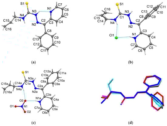 The crystals of HL, [H2L]Cl, and [H2L]NO3 belong to the monoclinic P21/c space group (Table 1), and their structure reveals that the planar (within ±0.08 Å) thiosemicarbazone fragment has an E-configuration in both the neutral and cationic forms with protonated N1 atom of pyridine substituent (Figure 2). The orientation of the pyridine fragment in the structure of HL is stabilized by the intramolecular N3–H···N1 = 2.669(3) Å H-bond, (Table 2). The dihedral angles between the mean planes of the thiosemicarbazone fragment and the pyridine and phenyl rings are 24.7(1)° and 41.7(1)°, respectively. In contrast to HL, the protonated cationic ligand [H2L]+ in the structures of [H2L]Cl and [H2L]NO3 has different positions for the pyridine and phenyl substituents in relation to the double azomethine bond N2–C2. In HL, the N3–N2=C2–C3 fragment has a Z-configuration, while in [H2L]Cl and [H2L]NO3 it has an E-configuration. Such an E-configuration is stabilized by charge-assisted hydrogen bonds with an anion: N1–H···Cl1 and N4–H···Cl1 in [H2L]Cl, and N1–H···O3 and N4–H···O3 in [H2L]NO3 (Table 2). The structure of [H2L]NO3 contains four identical formula units (a, b, c, and d) in the asymmetric part of the unit cell, Z′ = 4. One of these units is shown in Figure 2c. Overlaying the four [H2L]+ cations reveals differences in their conformations, which are primarily related to the orientation of the phenyl ring and the aryl substituent. The dihedral angles between the mean planes of the thiosemicarbazone fragment and the pyridine and phenyl ring are 7.5(1)° and 67.6(1)° in [H2L]Cl, and 1.2(2)° and 65.0 (1)° in a, 11.0 (2)° and 60.1(1)° in b, 1.4(2)° and 64.8(1)° in c, and 0.9(2)° and 63.6(1)° in d, respectively, in the structure [H2L]NO3. Thus, in the cationic form of [H2L]+, the protonated pyridine ring is approximately coplanar with the thiosemicarbazone fragment.