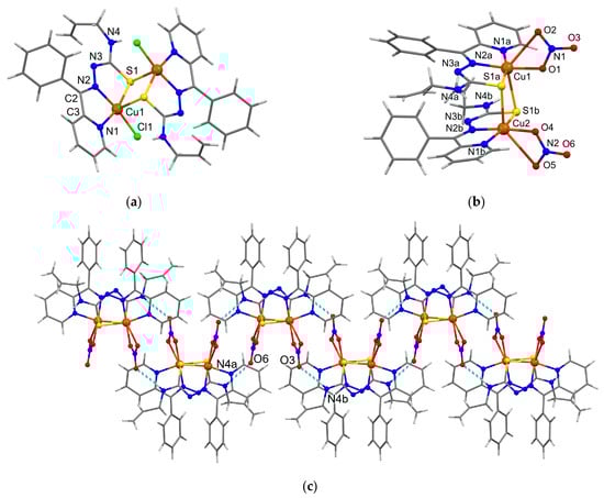 The complexes 1 and 3 of copper(II) crystallize in the triclinic crystal system, specifically in the P space group (see Table 1). According to structural analysis, compound 1 forms a centrosymmetric, neutral dimer with Ci molecular symmetry, described by the formula [Cu(L)Cl]2. In this structure, the sulfur atoms labeled S1 serve as bridging ligands, linking the two monomeric units, which are arranged in an antiparallel configuration (Figure 3a). The structure of compound 3 also reveals a dimeric complex [Cu(L)(NO3)]2 built from two symmetry-independent monomeric complexes (Z′ = 2) with a molecular symmetry similar to C2, with the atoms S1a and S1b also acting as bridges (Figure 3b). In both compounds 1 and 3, the tridentate ligand binds to the copper ion in its mono-deprotonated (L−) form through a donor set comprising nitrogen–nitrogen–sulfur (NNS) atoms (Figure 3). This coordination results in the formation of two fused, nearly parallel five-membered metallacycles (CuSCNN and CuNCCN) with the dihedral angle between their average planes measured at 1.95° in complex 1, and at 1.95° and 1.32° for ligands a and b in complex 3, respectively. Coordination with Cu(II) leads to a configurational isomerization of the thiosemicarbazone fragment within L−, converting it from the E- to the Z-isomer, which promotes a stable tridentate chelating interaction. In the dimeric structure of complex 1, the Cu1 center is pentacoordinated and adopts a distorted square-pyramidal geometry (τ = 0.069), where the basal plane consists of Cl and NNS donor atoms, and the apex is occupied by a bridging sulfur atom. Meanwhile, in complex 3, both the Cu1 and Cu2 centers are hexacoordinated, displaying a distorted square-bipyramidal geometry (Table S1). There are NNOS atoms in the basal plane, a bridging sulfur atom at one of the vertices, and a weakly coordinated second oxygen atom from the nitrate anion at another vertex. The Cu1–S1* distance in 1 is 3.047(1) while the Cu1–S1b and Cu2–S1a distances in compound 3 are 2.856(2) and 2.793(2) Å, respectively (Table 3). The Cu1 atom displaces from the mean basal plane towards the bridging sulfur atom by 0.109 Å in 1, and by 0.093 Å (Cu1) and 0.069 Å (Cu2) in 3. In the crystals of 3, the dimeric complexes are linked in a supramolecular chain along the c-axis by N4a–H···O6 and N4b–H···O3 hydrogen bonds (Figure 3c, Table 2).