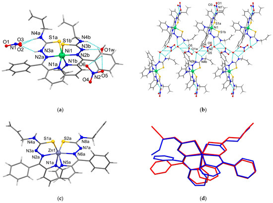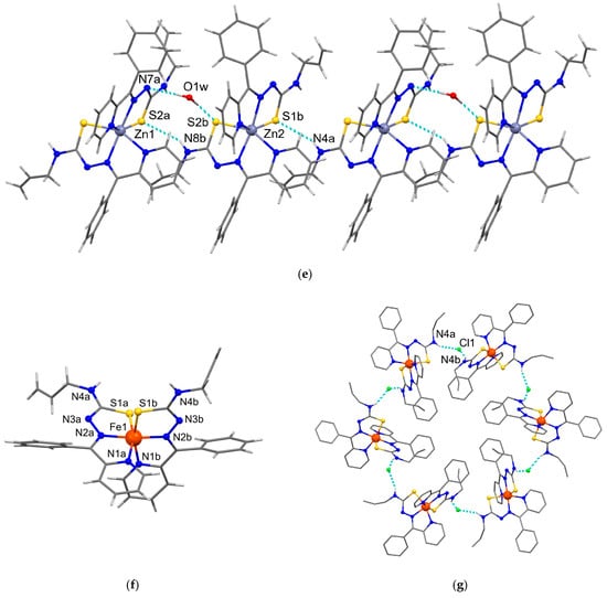 The Ni(II) (5), Zn(II) (7) and Fe(III) (8) bis-ligand complexes crystalizes in the Pca21 orthorhombic, P triclinic, and R trigonal space groups, respectively (Table 1). In these complexes, the metal atom coordinates two ligands in the NNS chelating mode, resulting in an octahedral coordination surrounding (Figure 4a). Similar to complexes 1 and 3, each ligand forms two fused and approximately coplanar five-membered metallacycles, CuSCNN and CuNCCN. In the crystals of 5 with composition [Ni(HL)2](NO3)2·H2O, the ligands coordinate in neutral form, and the charge balance in the crystal is provided by two outer-sphere nitrate anions. One of them forms N–H···O hydrogen bonds only with the cationic complex, while another one forms N–H···O H-bond with the complex and O–H···O hydrogen bonds with the solvent water molecule. The latter also participates in N3b–H···O and N4b–H···O hydrogen bonds. These H-bonds result in the formation of a supramolecular tape of charged components and water molecules running along the c axis, as shown in Figure 4b and Table 2. In the crystals of 7, the asymmetric part of the unit cell contains two similar but symmetry-independent complexes of zinc (A and B), shown in Figure 4c, and one solvent water molecule with an occupancy coefficient of 0.25. This results in the composition [Zn(L)2]·0.125H2O of compound 7. The structure of the zinc complex is similar to that found in 5. However, the ligands coordinate in their mono-deprotonated forms, which provides the complex with neutrality. Figure 4d illustrates the similarity of the independent complexes, showing that the major differences are related to the orientation of the phenyl ring and the aryl branches. In the crystal of 7, the alternating complexes A(Zn1) and B(Zn2) form a supramolecular chain along the [−110] direction via direct N–H···S H-bonds, as well as O–H···S and O–H···N H-bonds, involving water molecules, shown in Figure 4e. A similar structure of the bis-ligand complex Fe(III) was found in the crystal of 8 with the composition [Fe(L)2]Cl. The asymmetric part of the unit cell contains one mono-cationic complex, shown in Figure 4f, and an outer sphere chlorine anion. In the crystal structure, the chlorine anion forms two N–H···Cl hydrogen bonds with neighboring complexes and results in a supramolecular corrugated ring of six complexes around a special position of a three-fold inversion axis (Figure 4g).